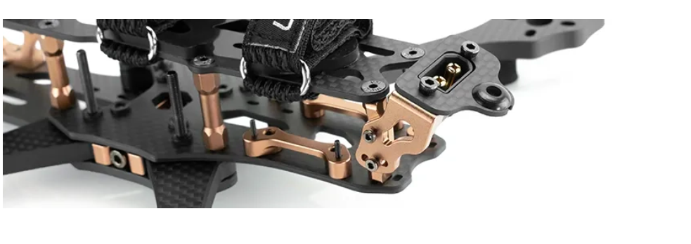 With 6mm thick arms, the frame achieves an unrivaled balance between durability and weight (~133g), the adjustable XT60 aluminum socket and the rear accessory holder offer various connection options as well as the ability to add antennas, GPS and rear-facing action cameras.