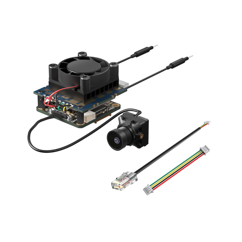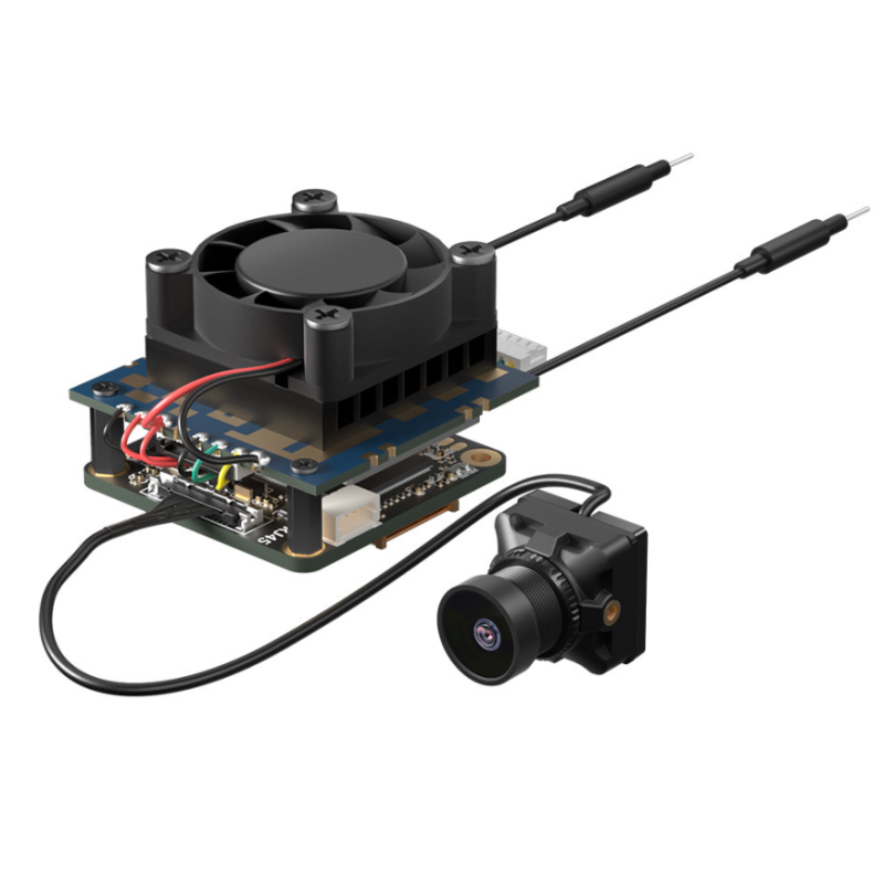 Linked to a Runcam camera based on a Sony IMW415 sensor, it delivers meticulously calibrated image quality for crisp, detailed visuals across its 160° FOV. You'll also find a component, a Wi-Fi module with a fan on top and two antennas.