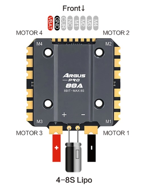 L’Argus Pro 80A se distingue par sa combinaison de haute performance, de refroidissement optimisé, ce qui en fait un choix idéal pour les builds 4–8S désireux d’allier puissance et fiabilité.