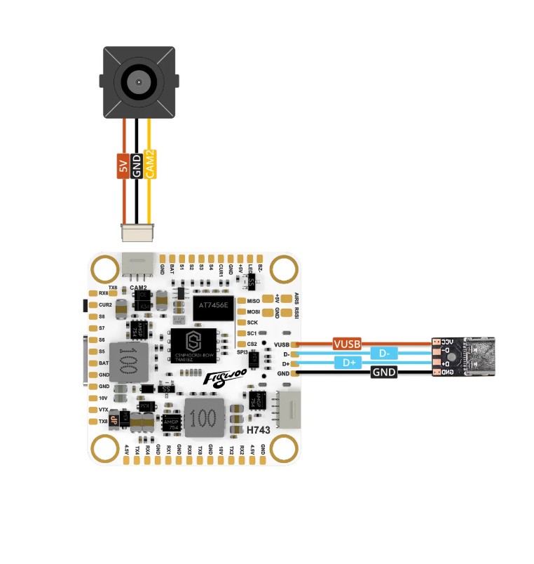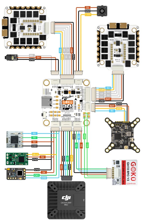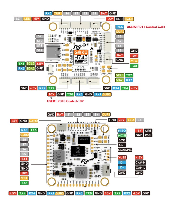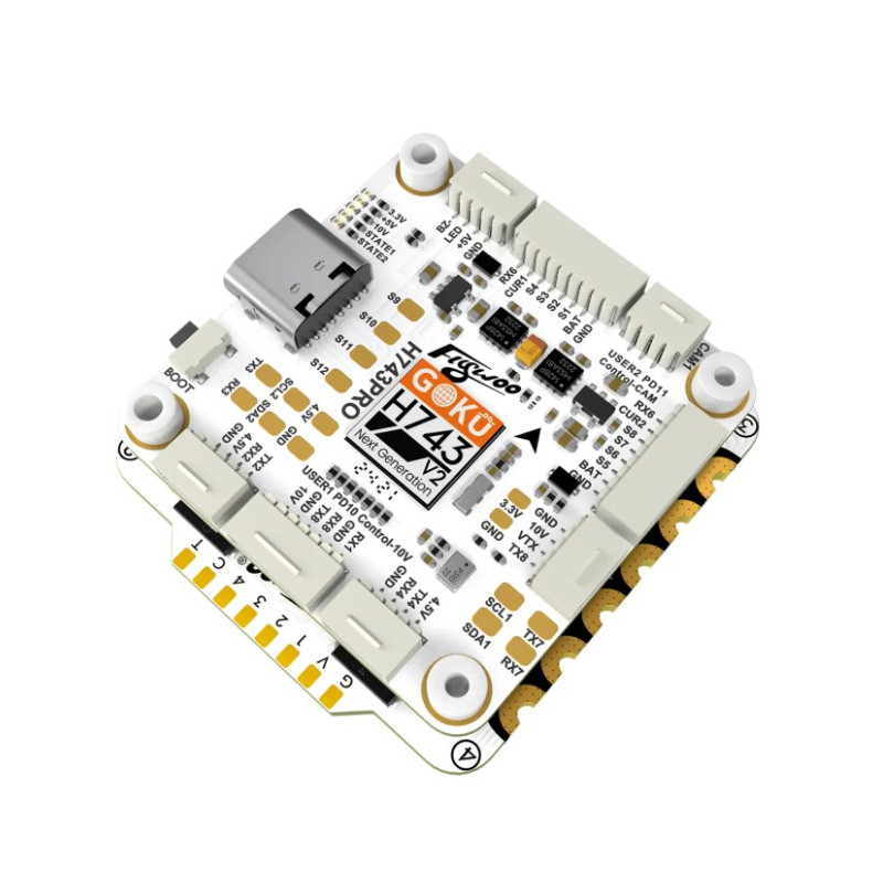 Le GOKU H743 Pro intègre des fonctionnalités complètes : prise en charge de deux caméras (CAM1, CAM2), sortie pour VTX analogique ou compatible DJI, ports pour GPS, récepteur, buzzer, ainsi que des interfaces UART/I2C multiples pour connecter facilement tous les composants de votre drone. Avec son espace de stockage de 512 Mo pour la blackbox, il permet d’enregistrer l’ensemble des données de vol pour analyse, utile pour le tuning ou le diagnostic.