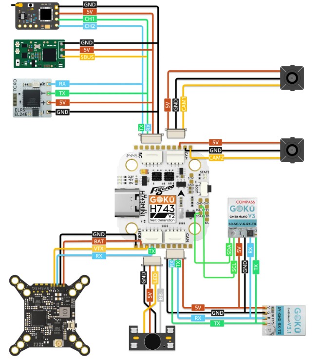Le GOKU H743 Pro Mini propose une connectique complète : ports pour deux caméras, sortie VTX analogique ou compatible DJI, interfaces pour GPS, récepteur, buzzer, ainsi que multiples ports UART et I2C pour faciliter l’intégration de tous les composants du drone. Sa mémoire intégrée de 512 Mo pour la blackbox permet d’enregistrer les données de vol pour analyse ou ajustement, un atout précieux pour le tuning et le diagnostic.